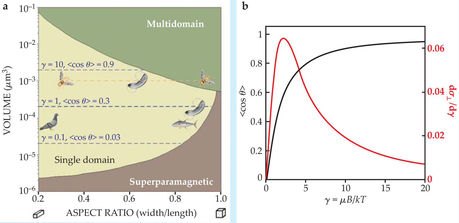Figure 3. Magnetite properties. (a) The behavior of magnetite crystals depends on their volume and aspect ratio. Large particles separate into multiple domains, while small particles are superparamagnetic, their moments tumbled by thermal fluctuations. In the yellow region, crystals are single domain. The dashed blue lines show three different values of the ratio γ of the magnetic energy µB to the thermal energy kT, and the associated average cosine of the angle θ between Earth’s field and the crystal as it is buffeted by thermal agitation. The average cosine is given by the Langevin function, 〈cos θ〉 = coth(γ) − 1/γ. The animal symbols indicate the geometric parameters of the crystals found within them. (b) Alignment of the crystal (black) requires the magnetic coupling to be roughly six times the thermal energy. But its sensitivity to changes in the field strength, as determined by the derivative with respect to γ of the standard deviation of the component perpendicular to field (red), peaks for ratios near 2.