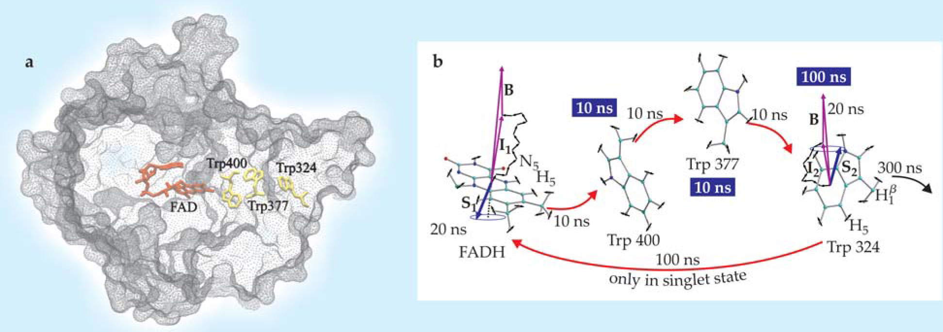 Figure 5. Cryptochrome is a candidate magnetoreceptor based on pairs of radicals. (a) The key components, illustrated on this electron density image, are the chromophore flavin adenine dinucleotide and three tryptophan residues involved with the chromophore’s reduction to the hydrogenated FADH. (b) Following cryptochrome excitation by a blue photon, holes transfer from FADH through the chain of tryptophan residues (the reaction steps are labeled by their time constants, and the tryptophans by their radical-state lifetimes). The resulting unpaired electron spins S 1 and S 2 precess about the local magnetic field produced by the addition of the external magnetic field B and the contributions I 1 and I 2 from the nuclear spins on the two radicals. Hole back-transfer from tryptophan-324 to FADH quenches cryptochrome’s active state but can occur only when the radicals’ electron spins are in a singlet state.