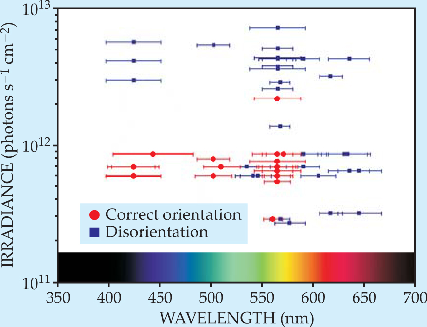 The photoexcitation possibility has inspired a large number of experiments—mostly performed by Wolfgang Wiltschko, Roswitha Wiltschko, and John Phillips—that have examined animals’ magnetic orientation behavior under different wavelengths of light, on the assumption that the candidate molecules are in the visual system. The orientation behavior of many species has been found to change under specific wavelengths and intensities, but the results have been bewildering, with different intensities and wavelengths of lights leading to orientation in the correct direction in Earth’s field, to random movements, or to orientation in the wrong direction. The data are difficult to interpret, since they do not fit the absorption spectra of any known photoreceptive molecule. An examination of the experiments on birds reached only two general conclusions: Magnetic orientation is disrupted when animals are exposed to light levels above 1012 photons/(s·cm2) or to light at wavelengths greater than 565 nm (figure 6). Because dimmer, blue light occurs after sunset, the time when the birds begin to migrate, it is possible that the ambient light simply signals the birds that it is time to begin orienting in the appropriate migratory direction rather than affecting any compass mechanism (twilight has a visible irradiance less than 1012 photons/(s·cm2) and is, of course, blue). However, the pattern of responses is also consistent with the cryptochrome hypothesis because long-wavelength light temporarily deactivates the molecule.
