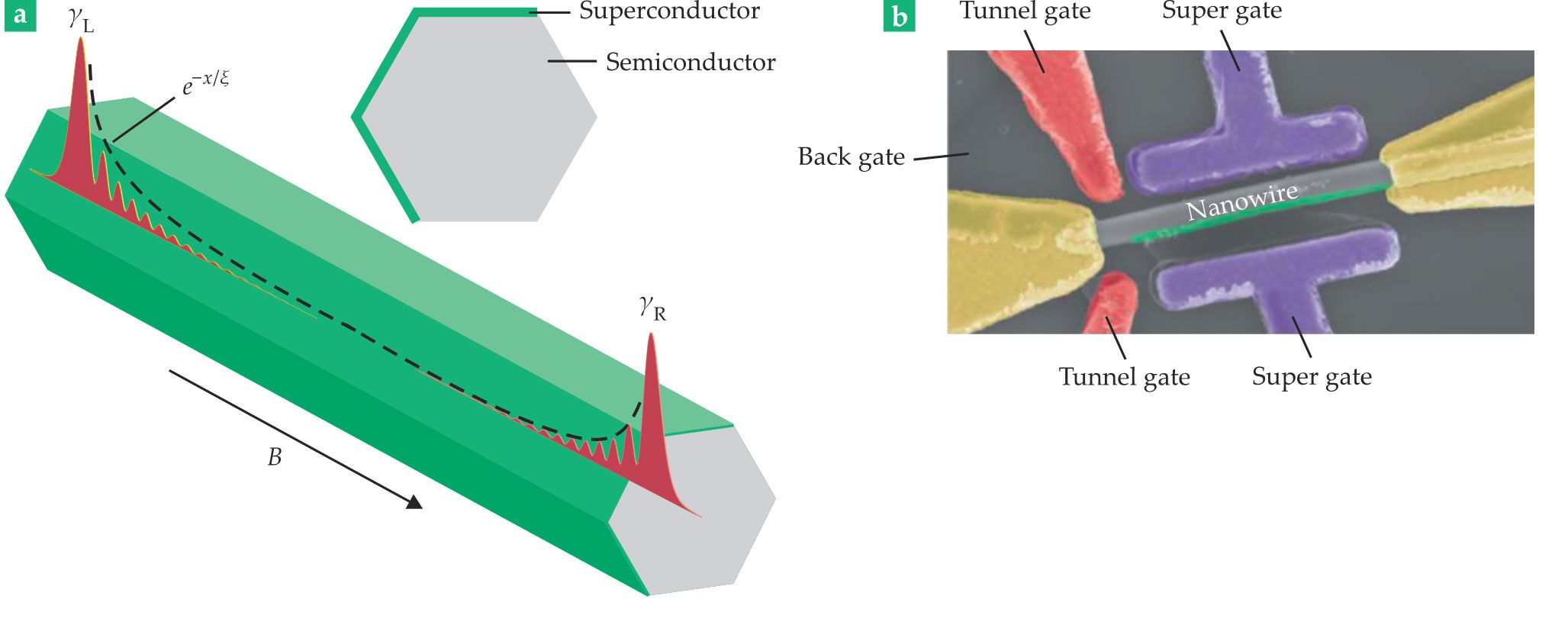(a) The nanowire proposal3 takes a nanowire of a semiconductor, such as indium arsenide or indium antimonide, that has strong spin–orbit coupling and places it in contact with an s-wave superconductor, such as aluminum, in the presence of an external magnetic field B. As in the original model for one-dimensional p-wave superconductors,4 the nanowire device experiences a topological nontrivial phase with exponentially decaying Majorana bound states, denoted γL, at both ends of the nanowire. (b) An actual device from Delft University of Technology includes various metallic gates for tuning it to the topological phase by adjusting the nanowire’s chemical potential. (Panel a adapted from ref. 3, R. M. Lutchyn, J. D. Sau, S. Das Sarma; panel b adapted from H. Zhang et al., Nature556 74, 2018.)
