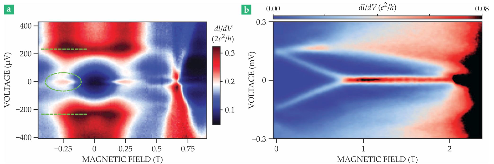 (a) A contour plot of dI/dV versus voltage V and external magnetic field B along the axis of an indium antimonide nanowire in contact with niobium titanate nitrate shows that for fields between 100 mT and 400 mT, a clear zero-bias anomaly (ZBA, green dotted oval) emerges in the middle of the superconducting gap, denoted by the dashed green lines. (b) An indium arsenide nanowire coupled to aluminum shows a robust ZBA. (Panel a adapted from ref. 5; panel b adapted from ref. 8.)