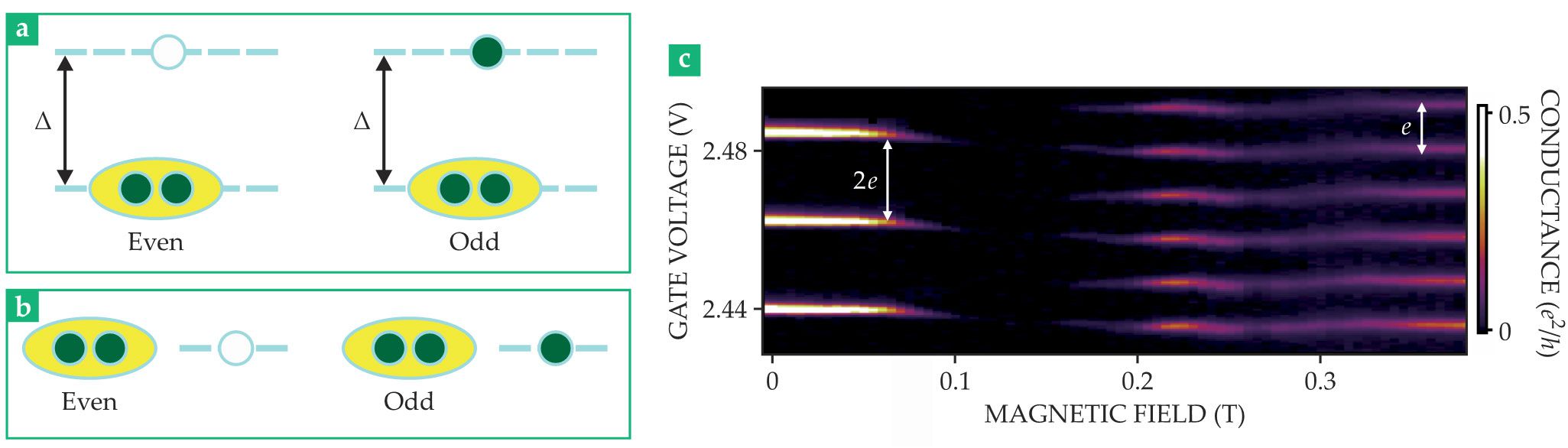 If the gap is larger than the charging energy, however, electrons enter the island only as Cooper pairs. As the magnetic field increases, the quasiparticle gap reduces until the superconductor becomes topological. At that point, it can accommodate one extra electron in the nonlocal Majorana zero-mode state with zero energy, regardless of whether it is empty or full, as figure 4b illustrates. Experiments with short proximitized nanowires show a change in periodicity, evident in figure 4c, that is consistent with Majorana theory: The flow of Cooper pairs transitions to single electrons as the magnetic field increases.