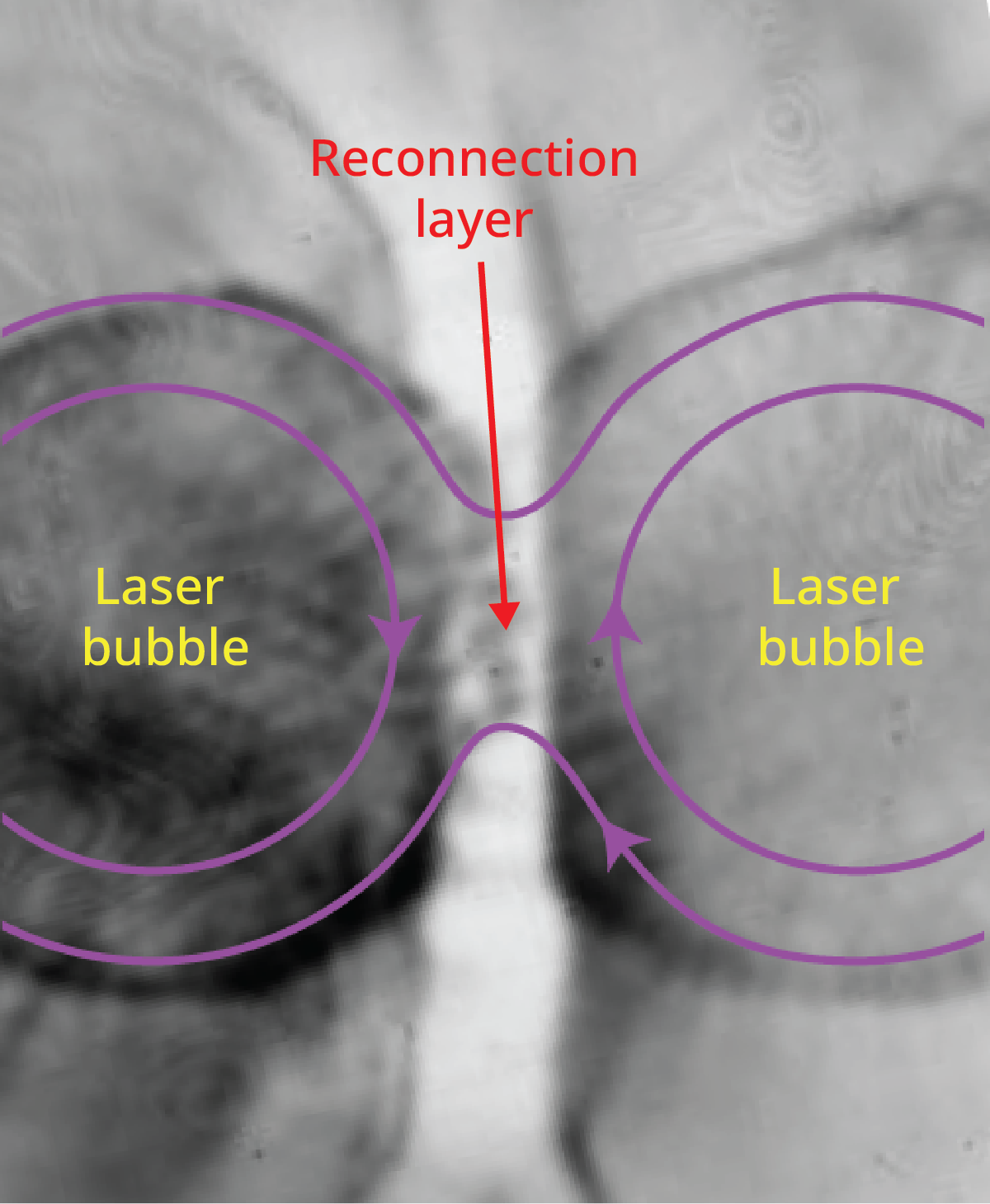 Hot, dense, and expanding bubbles of plasma (dark regions) can be made in the lab by a focused laser that rapidly heats a target. Because the plasma has nonparallel density and temperature gradients, the thermoelectric effect called the Biermann battery generates a magnetic field. Shown schematically in purple, the field is capable of deflecting a beam of high-energy protons, which researchers used to image a laser-driven magnetic reconnection event. The reconnection layer is a sheet of intense electric current, which rapidly heats and accelerates the plasma and changes the topology of the magnetic field.