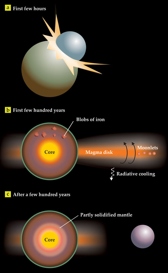 Figure 1. The giant-impact hypothesis.(a) A Mars-sized body hit Earth obliquely at a velocity not much higher than Earth’s escape velocity, 11 km/s. Most of the impacting material merged with Earth in about 24 hours or less. (b) About 20% of the material ended up in close orbit and formed a magma disk of liquid and gas that spread, became well mixed, and cooled over hundreds of years. Roughly half of that disk went into making the Moon; the other half fell to Earth. Moonlets beyond the Roche limit—the distance within which self-gravitating bodies are ripped apart by tidal forces—aggregated into the Moon in about a thousand years or less. (c) Blobs of iron from the impact eventually settled into Earth’s core, surrounded by a partially solidified mantle. A molten Moon formed just beyond 3 Earth radii and then rapidly receded, driven outward by the tides it raises in Earth. The Moon now orbits at 60 Earth radii. (Adapted from ref.
