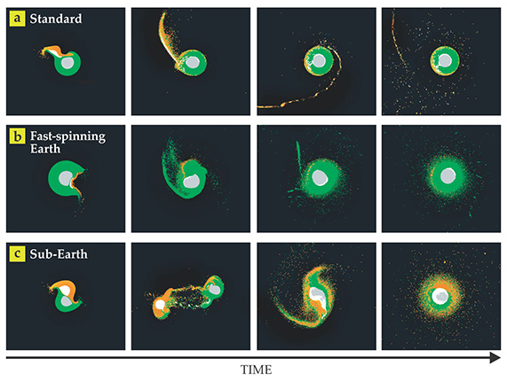 Figure 2. Hydrodynamic snapshots of giant impacts that might have been. In each of three cases, a projectile, whose mantle and core are shown in orange and white, respectively, obliquely hits Earth, whose mantle and core are shown in green and gray. Earth’s North Pole points out of the page. The aftermath of each collision, projected onto the equatorial plane, is pictured from left to right, with several hours elapsing between each snapshot. (a) In the