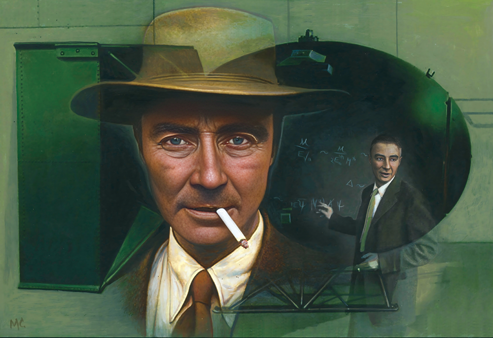 J. Robert Oppenheimer in typical postures—at the blackboard and with a cigarette. His goal as scientific director of the Manhattan Project was to develop a nuclear device that exploded from the fission of uranium-235 and plutonium-239. (Illustration by David McMacken.)