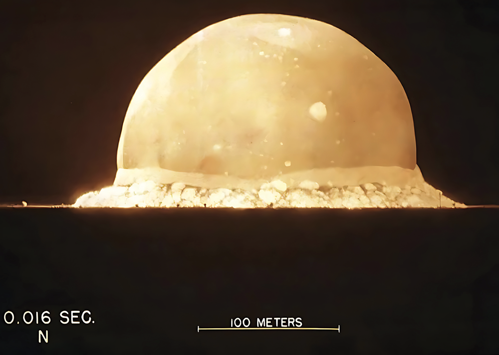 The Trinity fireball, 16 ms after ignition. That’s the moment of maximum energy release and localized heating of the atmosphere during the first nuclear weapon test. The fireball’s opacity prevented radiative energy loss, so the released heat was contained within the fireball. The lightly tinted spots on the fireball’s surface are locations where radiation emission would occur first. (Courtesy of the US Department of Energy.)