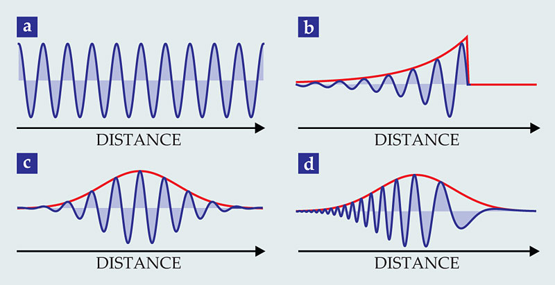 Figure 1. Single photons exist in a variety of shapes. These four examples show various photons at an instant in time; the red lines in panels b–d indicate wavepacket envelopes. (a) A monochromatic photon produced by an ideal laser. (b) A decaying exponential packet spontaneously emitted from an excited atom. (c) A Gaussian packet created by nonlinear optical processes. (d) A so-called chirped-frequency packet resulting from dispersive propagation in optical fiber.