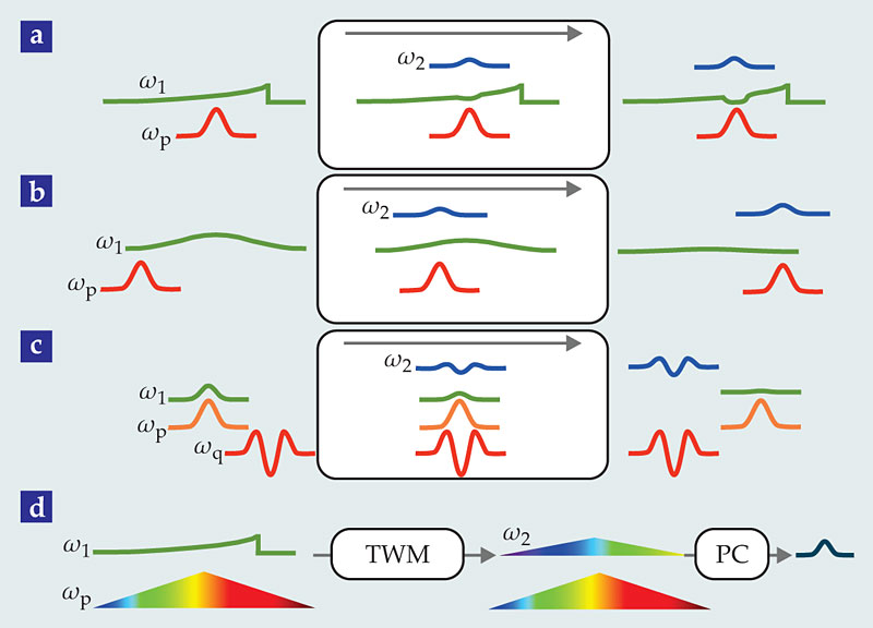 A fourth type of photon-reshaping scheme, proposed by David Kielpinski and colleagues, 18 is shown in figure 2d. If the pump pulse is appropriately tailored in spectrum and temporal phase, then those characteristics will be transferred to the converted photon. In the example shown, the pump has a time-varying frequency and the original signal photon is a negative exponential with a fixed frequency. Upon up-conversion, the new signal photon has a temporally varying frequency; it can then be compressed and shaped via a dispersive delay line, typically made with diffraction gratings.