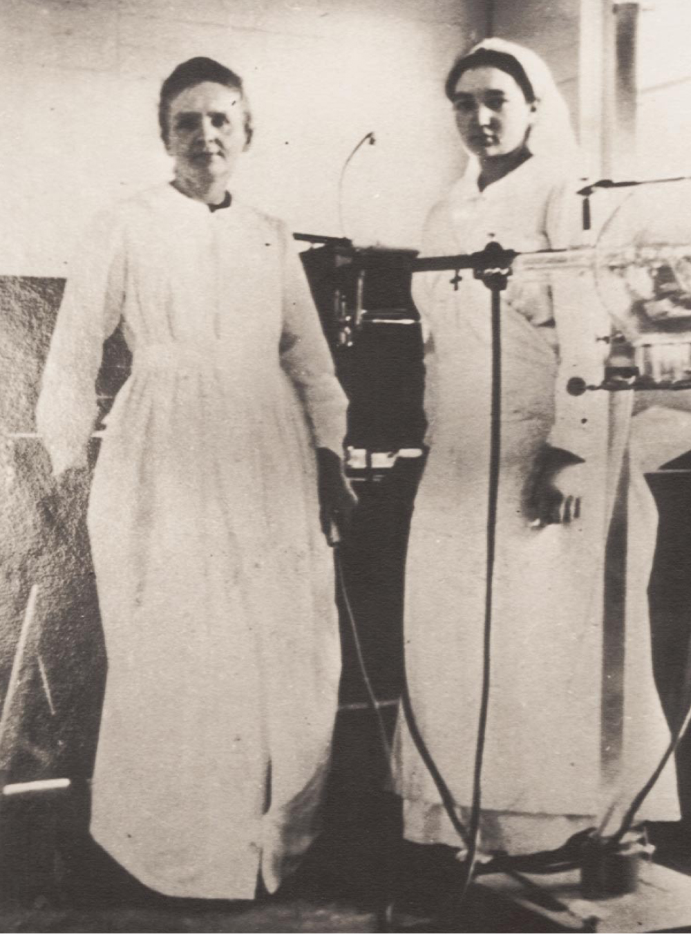 Marie and Irène Curie (right) with diagnostic x-ray equipment in a French military hospital during World War I.