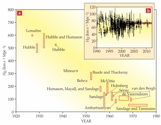 Figure 2. Hubble constant measurements. (a) The earliest measurements of H0 were about an order of magnitude greater than measurements made 50 years later. (Adapted from ref. 10.) (b) More modern measurements have tended to cluster around a range of 70–75 km s−1 Mpc−1, particularly since 2005 (red band). The most recent and precise measurement7 has an uncertainty of 3%; with improved instrumentation and data handling, astronomers hope to soon achieve a precision of 1%.