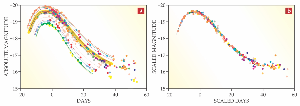 Figure 4. Type Ia supernova light curves. (a) As shown in these plots of magnitude (a logarithmic measure of luminosity; more negative values are brighter) versus time, luminosity decays more slowly for the brightest supernovae than it does for the fainter ones. (b) With a suitable rescaling of time and brightness, the supernovae plotted in panel a lie on a single curve. Because of that universality, type Ia supernovae can serve as standards for determining distance. (Courtesy of the Supernova Cosmology Project.)