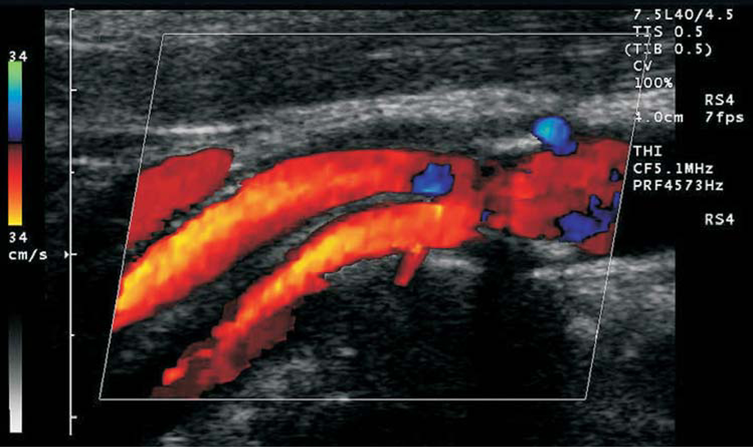 Admittedly, those phase shifts result from slightly different sets of blood cells being present in the interrogated volume from one pulse to the next and so are not, strictly speaking, Doppler shifts of individual scatterers. Nevertheless, as long as the change in scatterer distribution varies only slightly from pulse to pulse, CFI determines not only the average blood velocity but also a spectrum of velocities that can be color coded to represent forward and reverse blood flow. Such flow data are typically overlaid on the B-mode image in modern ultrasound scanners, as shown in figure 2.