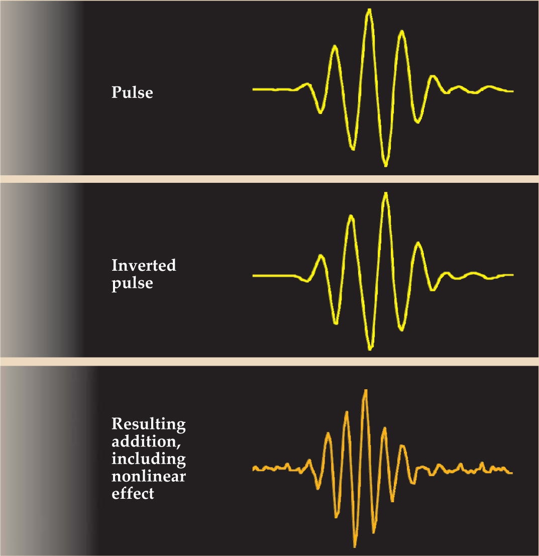 Figure 3. Tissue harmonic imaging relies on the nonlinear properties of tissue. A pulse and its inverse meet in tissue but because of nonlinearities the two pulses do not cancel. Instead, second-harmonic and other components arise.