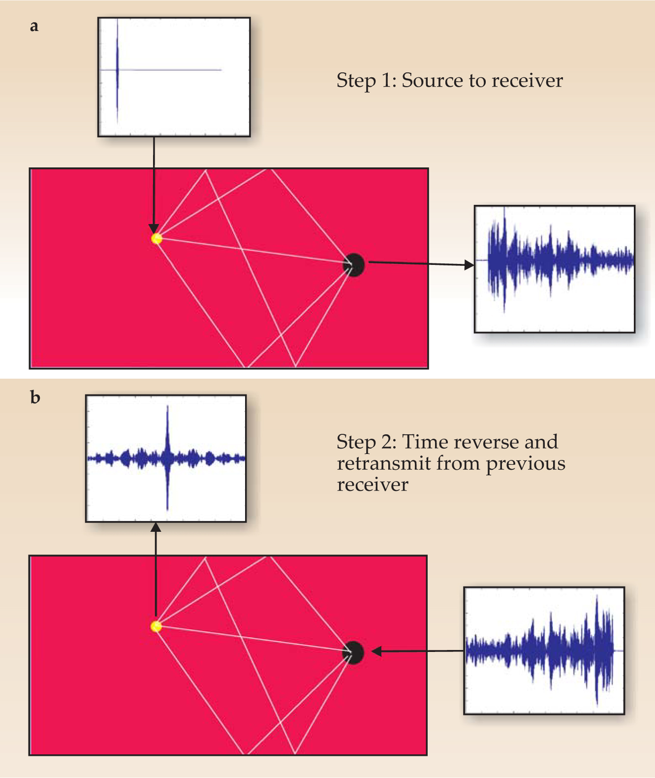 To use nonlinear superposition, large-amplitude, highly localized pulses must be made to intersect within the tissue volume. Since the late 1990s, a technique known as time-reversal acoustics (TRA) has provided a new tool to help accomplish that task. The basic idea is shown schematically in figure 4. In the first step, an acoustic source produces a pulse that propagates along many different rays to a receiver; the result is a complicated impulse response. In the second step, the pattern of pulse arrivals at the receiver is reversed, and the receiver now acts as a transmitter. Because the wave equation is time-reversal invariant, the pulses follow the step-1 rays in reverse and end up coinciding at the original source as a highly spatially and temporally focused pulse. In effect, the time-reversed signal at the receiver acts as an optimum filter to deliver subwavelength focusing at the original source location.