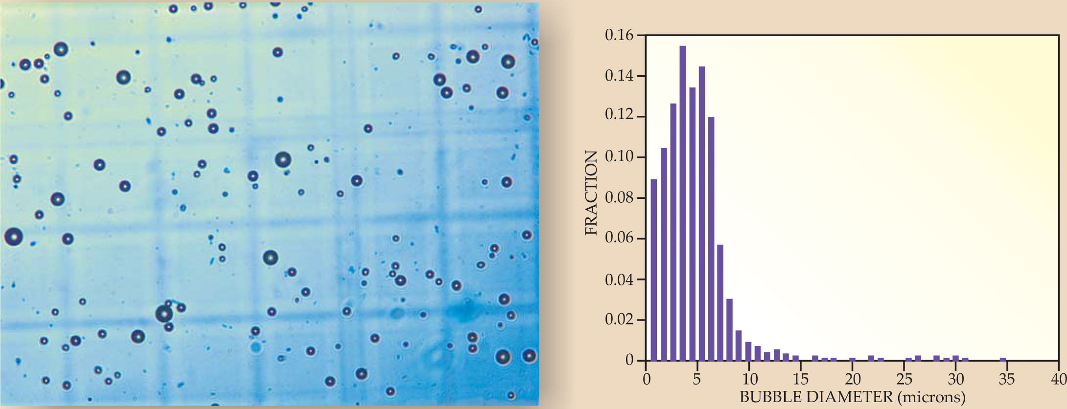 Figure 5. Microscopic bubbles are echo-contrast agents, strong reflectors of ultrasound. They may be used for diagnosis or may incorporate drugs that are delivered to specific sites. The microscope image to the left has a field of view roughly 300 microns across. The histogram to the right shows the size distribution of the bubbles seen in the micrograph.