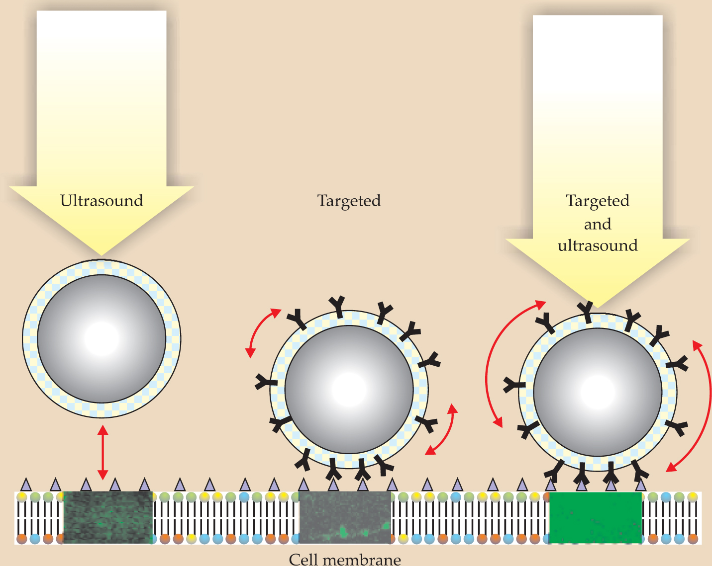Each bubble has an acoustic resonance frequency related to the mass of the liquid around the bubble and the stiffness of the gas inside it. For an ultrasonic beam with a dominant frequency component near a bubble’s resonance frequency, the acoustic radiation force can be strong enough to push the bubble to a vessel wall where drugs in the bubble coating can be released. As shown in figure 6, the combination of ligands to help the bubbles stick to the surface with an acoustic radiation force to press and wiggle the bubbles on the vessel wall enables a dramatic improvement in drug delivery compared with the cases in which either the ultrasound or ligands are absent. A specific example of targeted drug delivery using ultrasound and bubbles is the delivery of chemotherapeutic agents to a tumor only, rather than systemically.