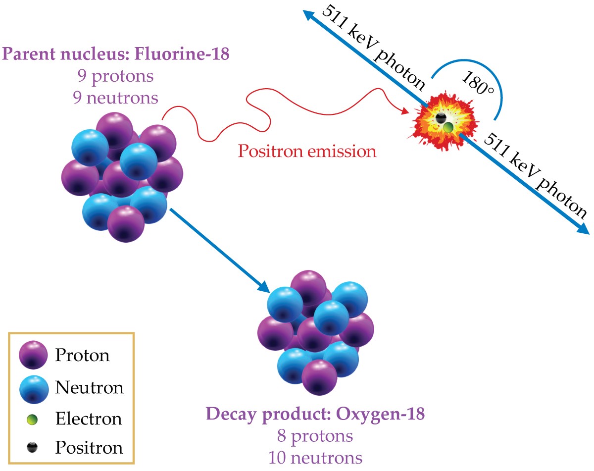 Positrons are emitted in the decay of fluorine-18 to oxygen-18 when a proton in the 18F nucleus gets converted to a neutron. Within less than a millimeter of its original location, the positron will annihilate with an ambient electron. That annihilation produces two 511 keV gamma-ray photons, traveling in opposite directions, that can be detected by scintillation crystals in the ring of a PET scanner. Tens of millions of photon detections are compiled to generate PET scan images.