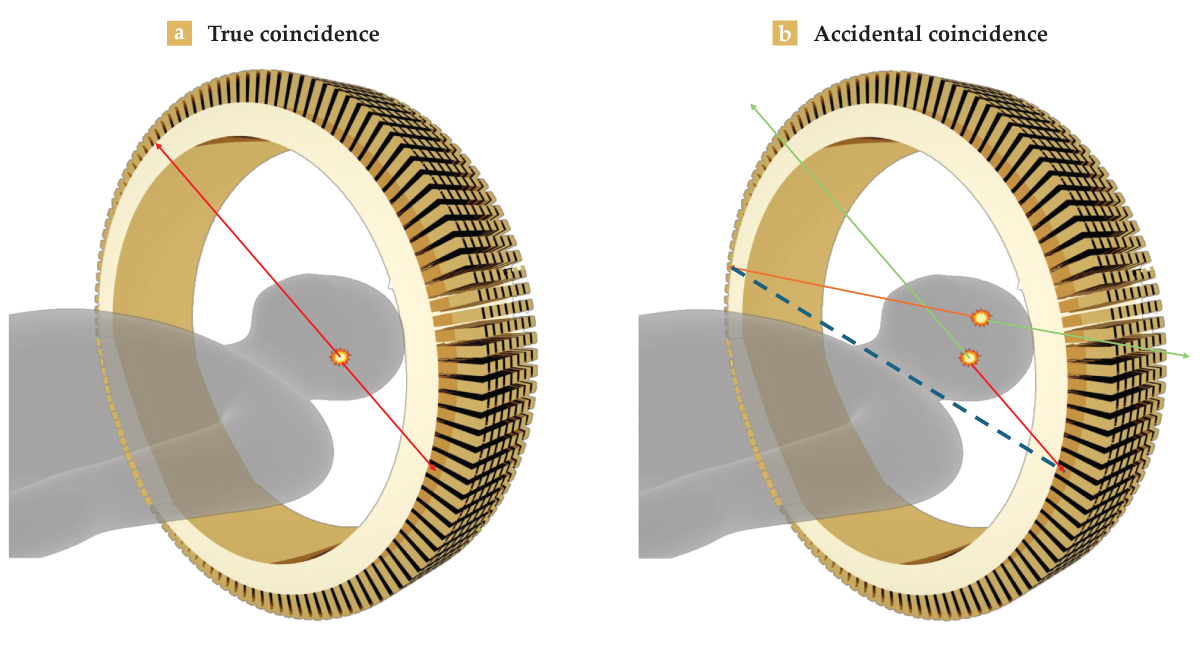 Coincidences are rejected if one of the photons has an energy of less than 511 keV, which signals that the lower-energy photon was scattered. If two 511 keV photons are detected but not within the 5 ns coincidence window, they are rejected because they must have originated from different decay events. It is possible that two independent decays occur within 5 ns of each other and that unrelated 511 keV photons are simultaneously detected, which creates an accidental or random coincidence. The random coincidence, if left uncorrected, would create the illusion that a decay event occurred along the dotted line in figure 4b. PET systems are designed to statistically account for and remove random events to the greatest degree possible.