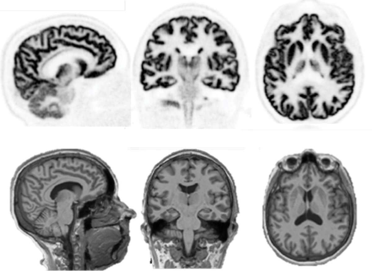 Image slices of the brain of a healthy control participant (top row), acquired 60–90 minutes after injection of a radiolabeled synaptic density marker. The images were made using a new dedicated human-brain PET imager, NeuroEXPLORER. Matching MRI anatomical images were also captured (bottom row). The ultrahigh resolution and sensitivity of the NeuroEXPLORER provide exquisite delineation of the folds of the brain’s cerebral cortex and structures deeper in the brain. (Image courtesy of Richard Carson on behalf of the NeuroEXPLORER consortium.)