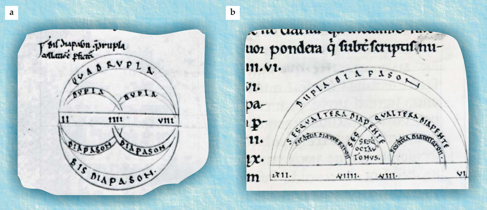Figure 2. The compounding of musical proportions was a standard technique of medieval music theory. (a) In this illustration, labeled Bis diapason quadrupla collatione perfecta, the middle line, labeled with the Roman numerals for 2, 4, and 8, represents an interval of two octaves. The numbers 2 and 4 that define the left-hand octave are connected by arcs labeled “double” and “octave,” as are the numbers 4 and 8 of the right-hand octave. The whole line is linked by arcs labeled “quadruple” and “two octaves.” Thus the 8 to 2 proportion of the two octaves is illustrated as being compounded of the proportions 8 to 4 and 4 to 2. (b) The bottom line, labeled with roman numerals for 12, 9, 8, and 6, represents an octave. The arc between 12 and 6 says dupla, diapason, or “double [proportion], octave.” The arcs from 12 to 8 and from 9 to 6 say sesquialtera, diapente, or “the proportion of 3 to 2, the musical fifth.” The arcs from 12 to 9 and from 8 to 6 say sesquitertia, diatesseron, “the proportion of 4 to 3, the musical fourth.” The arc—actually a gothic arch formed by bits of the other arcs—connecting 9 to 8 says sesquioctavus, tonus, “the proportion of 9 to 8, the tone.” Thus the octave is shown to be compounded of the musical fifth and fourth, or alternately of two fourths and a tone.