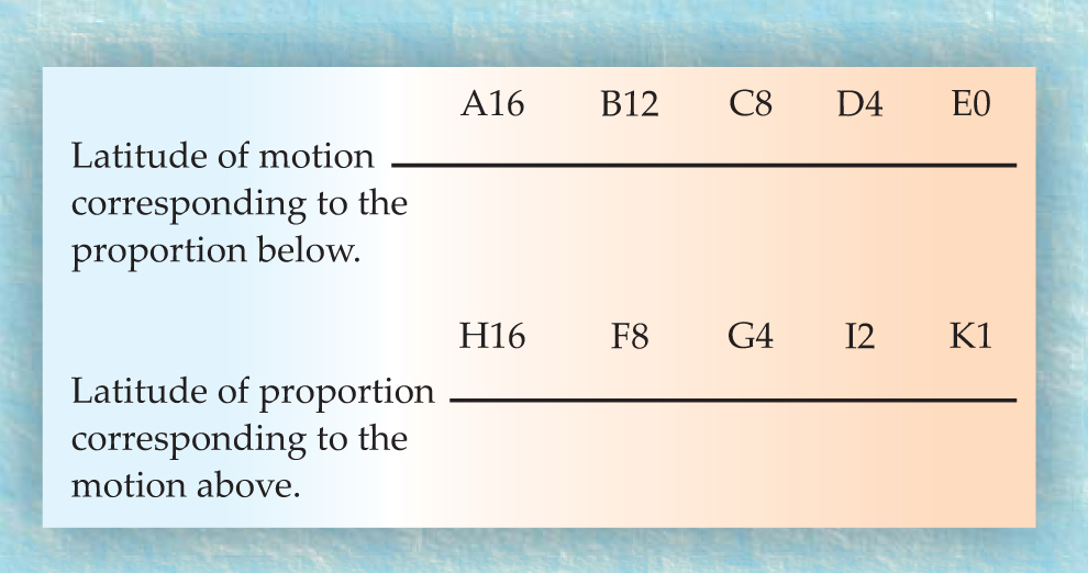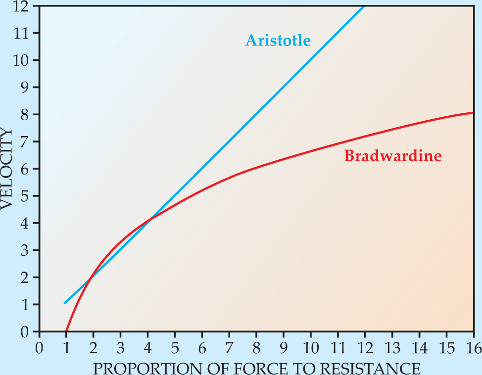 It is frequently said that Aristotle took a qualitative and common-sense approach to natural philosophy, not a mathematical one. Bradwardine, in contrast, emphasized that he was taking a mathematical approach (see the box on page 52). By expressing his law not in terms of forces or resistances separately but in terms of “proportions of greater inequality” (that is, proportions of a larger quantity to a smaller one), he could rightfully assert that his law could deal with all variations in such proportions and with all velocities.