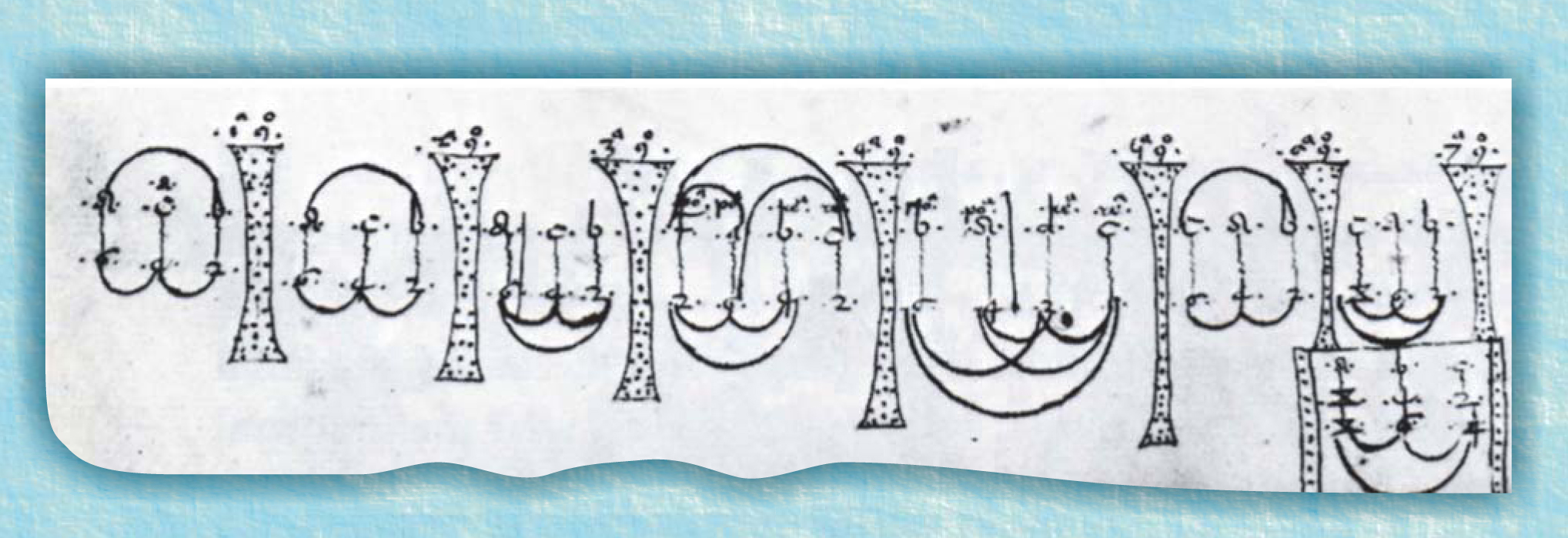 Figure 5. Swineshead’s rules, as given in his Calculationes (Calculations), could be expressed in terms of lines and arcs. In these drawings, Swineshead’s rule 1 is represented at the left and rule 4 is represented fourth from left. The numbers for rule 4 should be 12, 6, 4, and 2. Note how similar these diagrams are to the music-theoretic diagrams in figure 2.