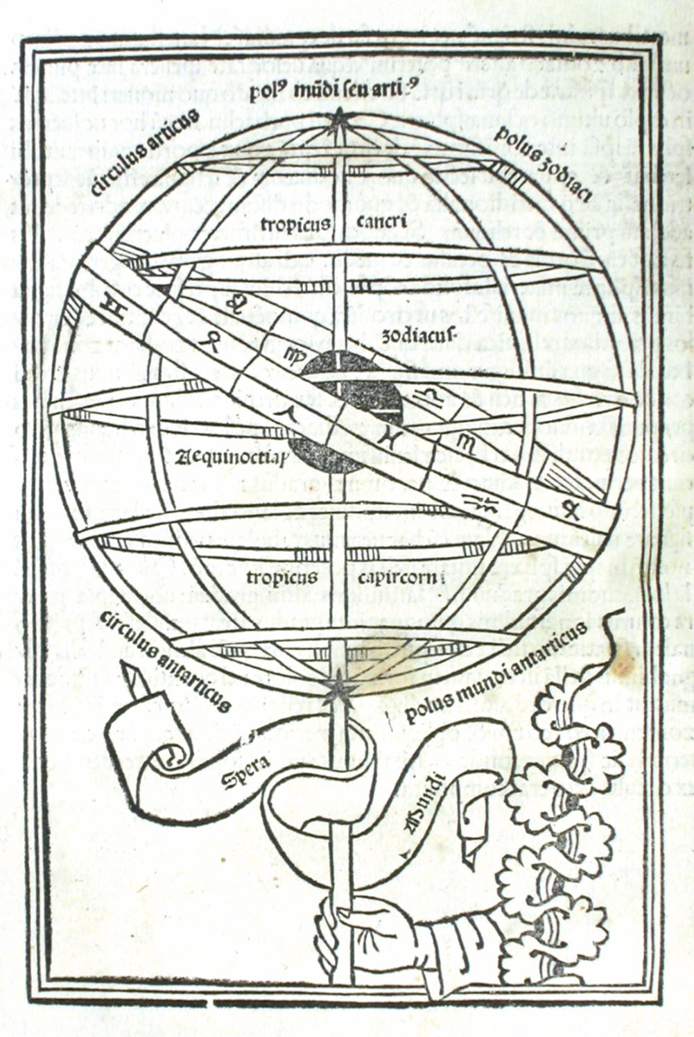 The zodiac. This illustration from Johannes de Sacrobosco’s De sphaera, printed in 1488, shows the circle of the zodiac and its various signs surrounding several latitudinal lines that demarcate the equator, tropics, and polar regions. For medieval scientist–philosophers, the climate zones and celestial divisions formed a basis for making astrometeorological predictions. (Courtesy of the History of Science Collections, University of Oklahoma Libraries.)