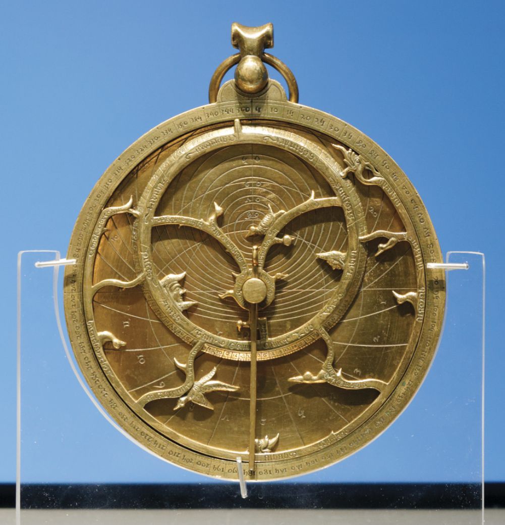Astrolabes, like the 14th-century English one pictured here and housed at the British Museum, were based on Islamicate models. It provides a map of stars and planets that’s calibrated for a chosen latitude with pointers to named stars. (Photo by Marie-Lan Nguyen, Wikimedia Commons, CC BY 2.5