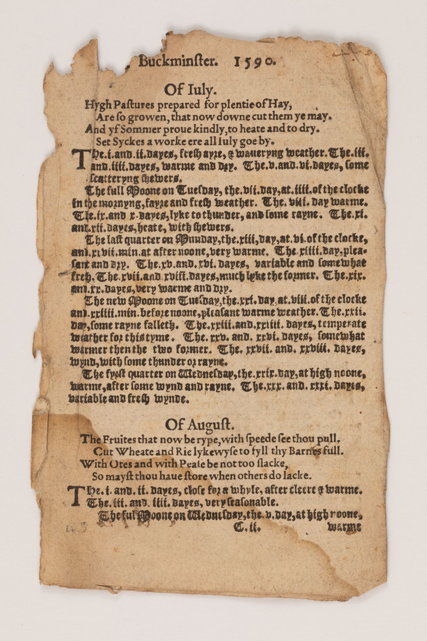 Almanac forecast. This page from Thomas Buckminster’s almanac for 1590 records his weather predictions for southern England in July and August. (Image from the University of Reading, Special Collections.)