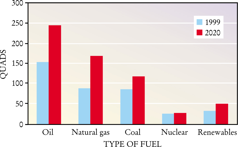 Figure 1. Energy consumption by fuel source. The graph indicates world energy consumption in quads (1 quad = 1.06 × 1018 joules) for the years 1999 and 2020 (estimate) for various fuel sources.