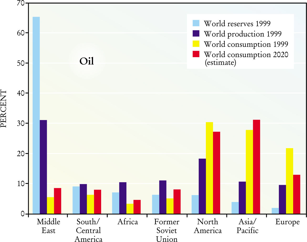 Figure 2. Oil production, consumption, and reserves by region, as a percentage of the world total.