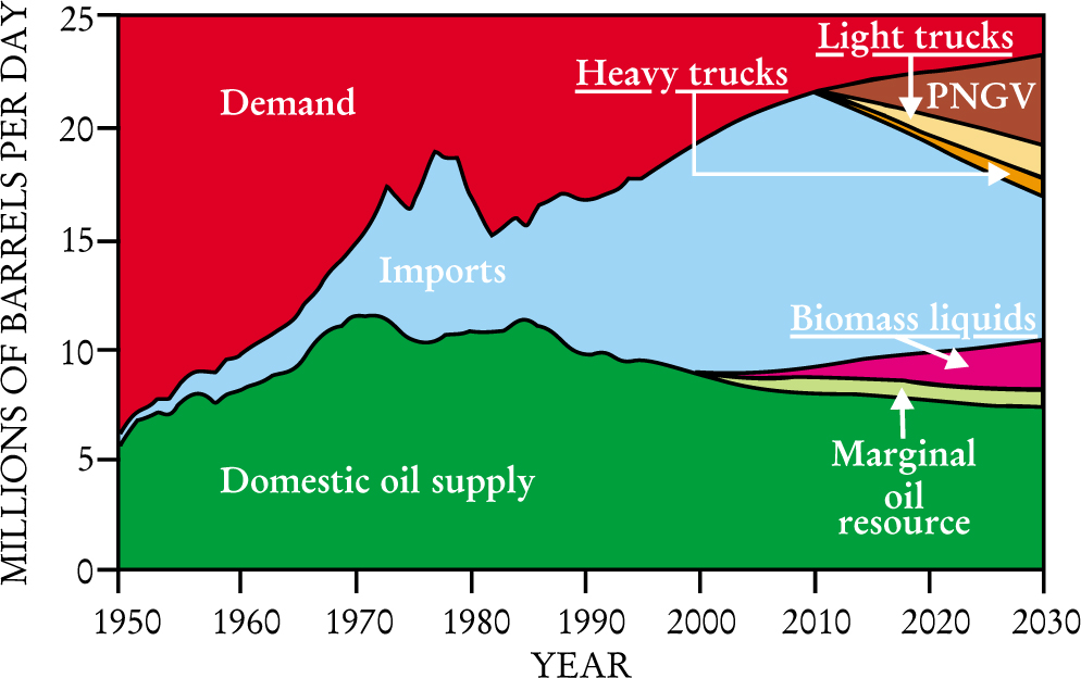 Figure 3 shows projections made by the President’s Committee [now Council] of Advisors on Science and Technology (PCAST) of how aggressive technology deployment will affect US oil dependence.