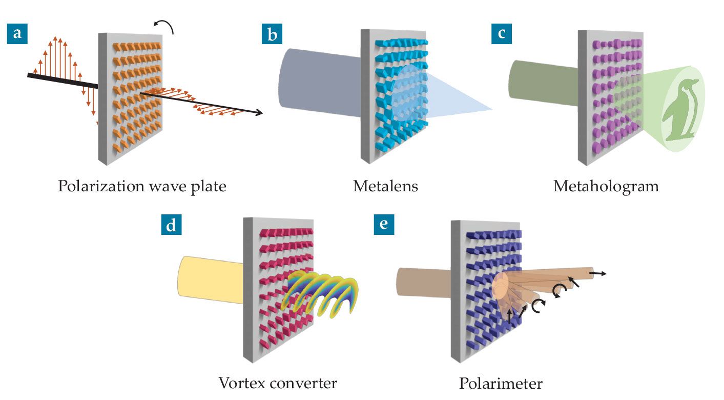 Metasurfaces use subwavelength structures to manipulate light’s wavefront. They can (a) rotate light’s polarization, (b) focus light, (c) generate three-dimensional images, (d) change light’s orbital angular momentum, (e) separate light based on polarization, and more. The ultrathin devices can replace bulky traditional classical-optics components.