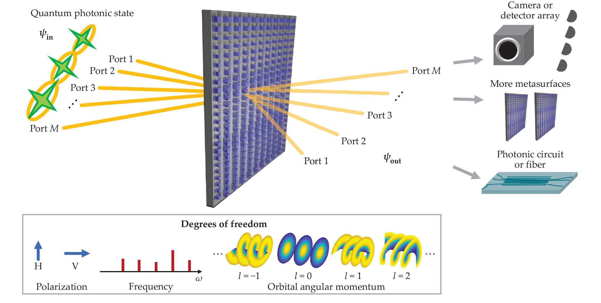 In quantum optics, information can be encoded in light’s polarization (horizontal H or vertical V), frequency ω, orbital angular momentum (given by quantum number l), and other properties. A metasurface can transform that information as it transmits photons from M input ports in state ψin to M output ports in state ψout. Those outputs can then lead to other optical elements, such as single-photon sensitive cameras, additional metasurfaces, and integrated photonic circuits or fiber interfaces, depending on the application.