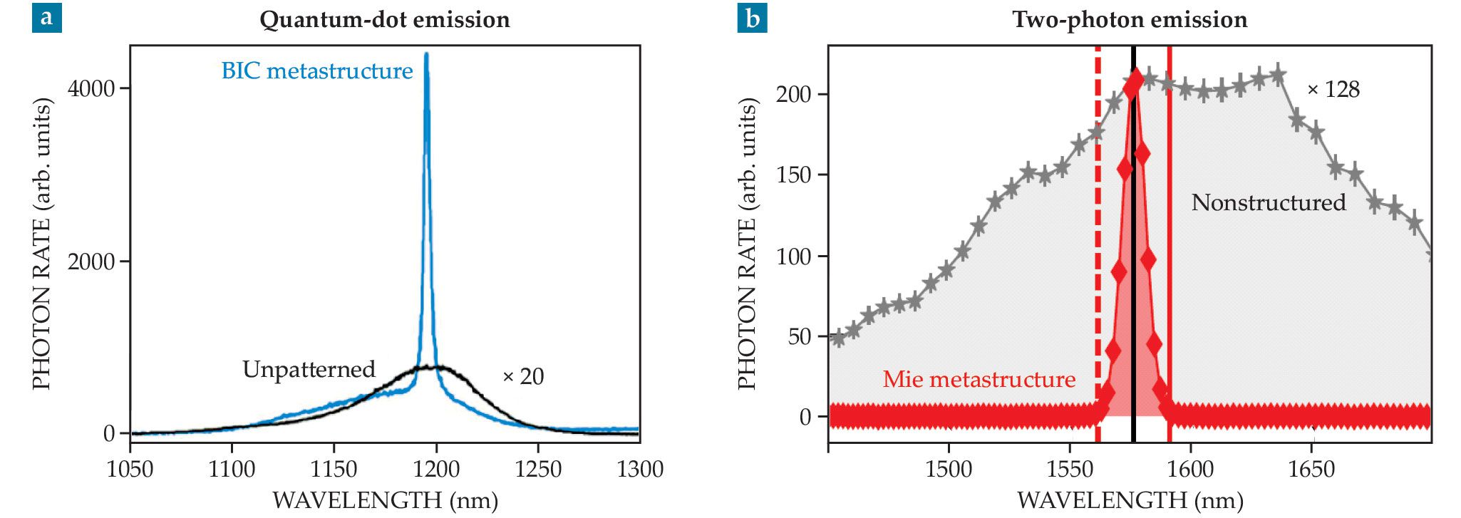 Resonances in metasurfaces enhance and shape the emission of quantum light. (a) In a gallium arsenide metasurface, resonances known as quasi-bound states in the continuum (BICs) sharpen and enhance the emission from an embedded indium arsenide quantum dot (blue) compared with the quantum-dot emission in a nonstructured GaAs layer (black). (Adapted from ref. 14.) (b) In a lithium niobate metasurface, the emission of photon pairs by a process known as spontaneous parametric down-conversion is also dramatically enhanced within a narrow spectral range (red) compared with the emission from a nonstructured lithium niobate layer (gray). (Adapted from ref. 15.)