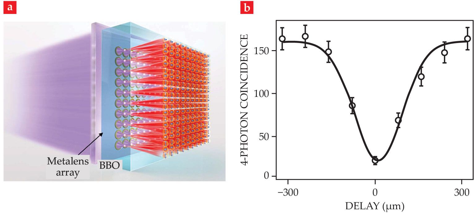 (see figure 4a). The 10-by-10 metalens array forms a multichannel pump that, in turn, generates photon pairs in 100 channels. The researchers demonstrated four-photon and six-photon generation in which the photons from different lenses were highly indistinguishable. The dip in the measured four-photon coincidences at zero delay in photon arrival times (figure 4b), and similarly for six-photon coincidences, indicates that the photons have coalesced because of their indistinguishability. That metasurface-based quantum photon source can easily switch between various high-dimensional entangled quantum states.