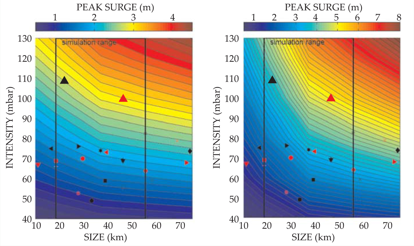 Figure 4. A storm’s size and intensity both contribute to storm surge. These contour plots show surges from idealized simulations that assumed a constant sea-bottom slope of 1/1000 (left) and 1/10 000 (right), typical values along the Louisiana and Mississippi coasts. Storm size is measured by the radius to the maximum winds and intensity by the difference between peripheral and central pressures. Results are extrapolated linearly beyond the simulation range indicated by vertical lines. The superimposed geometric figures give data for historic storms in the Gulf of Mexico. The two most intense storms are Hurricanes Camille (large black triangle) and Katrina (large red triangle). Even though Katrina was the less intense of the two, its size caused it to produce a much higher surge.