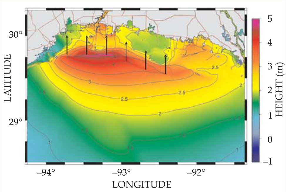 Figure 5. Inland marshes can attenuate storm surges, as happened in western Louisiana during Hurricane Rita. In this contour plot of simulated surge elevations, maximum surges occur at the coast. The vertical arrows aligned roughly east–west through the maximum indicate tracks inland from the coast that were used to estimate maximum surge attenuations.