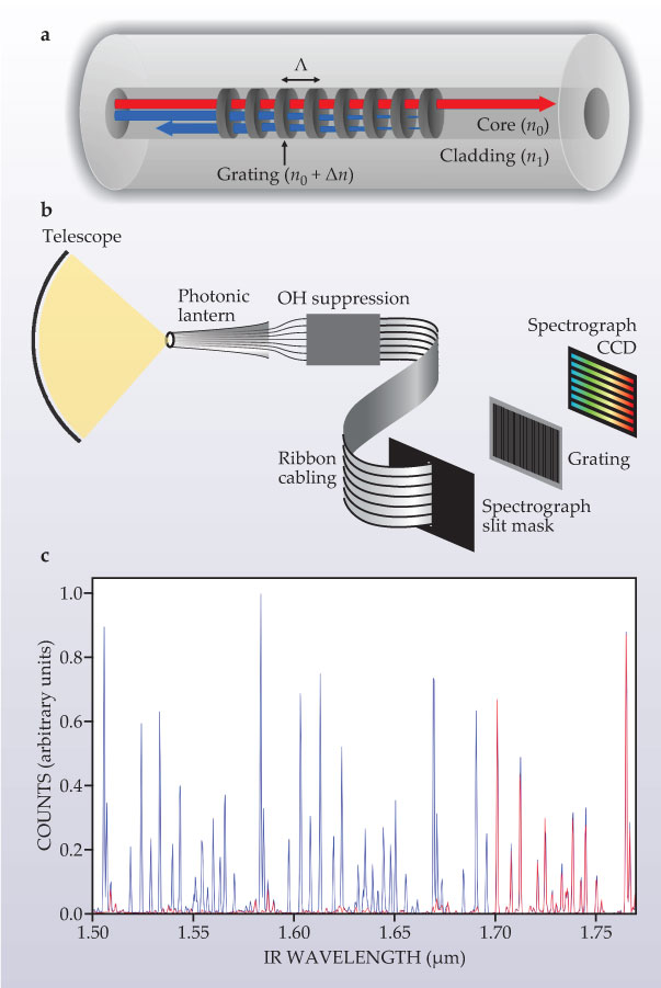An early successful application of astrophotonics has been to suppress unwanted noise sources in astronomical observations. When we look up at the night sky, we see stars, planets, and galaxies set against a dark background. But an infrared observer sensitive to wavelengths from 800 to 1800 nm is not so fortunate. The IR sky is overwhelmed by hundreds of very bright, narrow emission lines arising from excited OH radicals in Earth’s upper atmosphere. A long-standing goal of astronomy has been to achieve a dark IR sky by filtering out the unwanted local background. The only viable means at present for achieving the requisite complex filtering is based on fiber Bragg grating (FBG) technology.