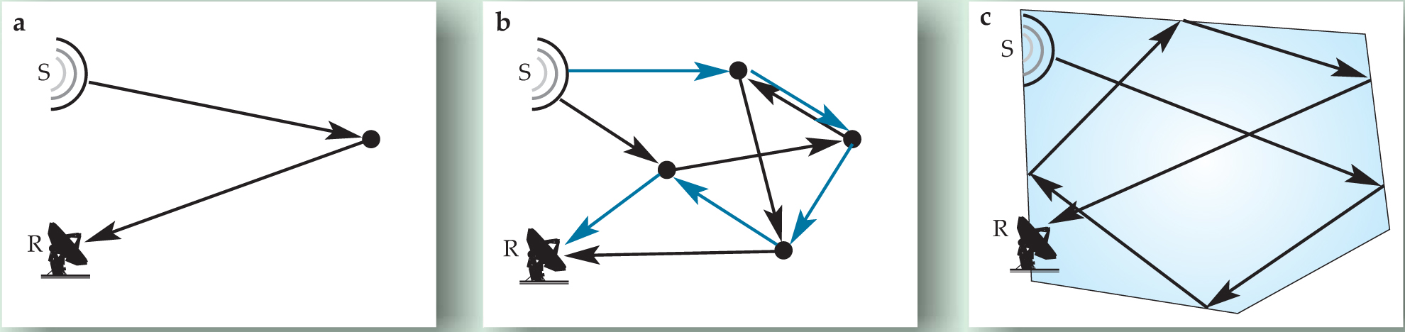 Figure 1. Singly versus multiply scattered waves. Singly scattered waves (a) that propagate from a source S to a receiver R traverse a region of space at most twice, while multiply scattered waves (b) can propagate many times in the same region. Reverberant waves (c) that bounce between boundaries can also sample the same region repeatedly.