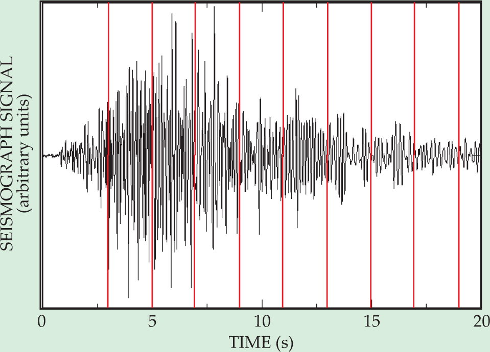 Figure 2. The vertical component of the ground motion recorded on 30 June 1998 on Mount Merapi, an Indonesian volcano. The waves are excited by an air gun on the side of the volcano a few kilometers away. The vertical red lines break the time series into independent windows for cross-correlating the data.