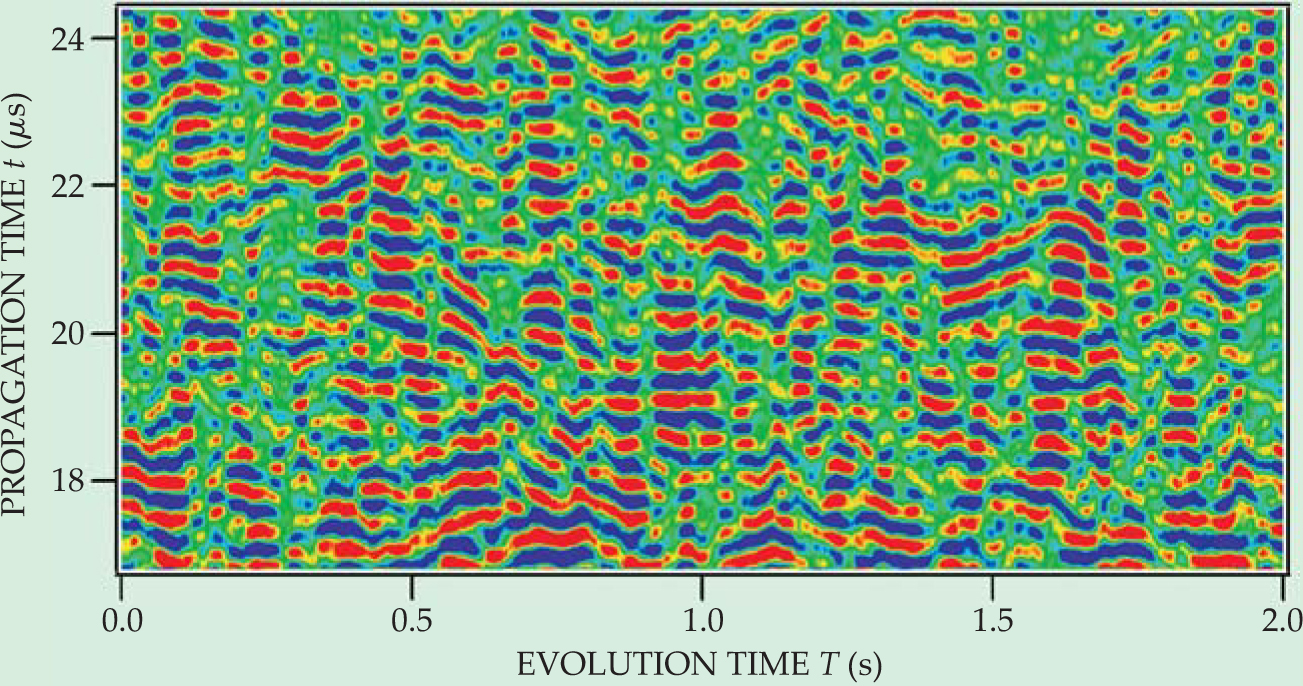 Figure 3. Pressure fluctuations of scattered acoustic waves as a function of wave propagation time t and evolution time T, the time at which the waves were sent through a suspension of bubbles in water. Positive fluctuations are in red, negative fluctuations in blue. At long propagation times, the waves are more sensitive to bubble motion that has occurred during the evolution time.