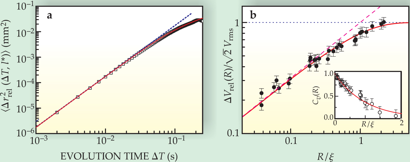 Figure 5. Determining suspension properties. (a) The relative mean square displacement, as a function of time interval ΔT, of beads in suspension. The data, extracted from the autocorrelation function calculated from the measured wave fluctuations in scattered ultrasound, scale as (ΔT)2 (dashed line) for short times, and also depend on the transport mean free path, l*. (b) The dependence of the relative particle velocity ΔVrel on the distance R between particles. The relative velocity has been scaled by the particles’ root mean square velocity, and the distance has been scaled by the particle correlation length ξ. The inset shows the particle velocity correlation function deduced from the measurements.