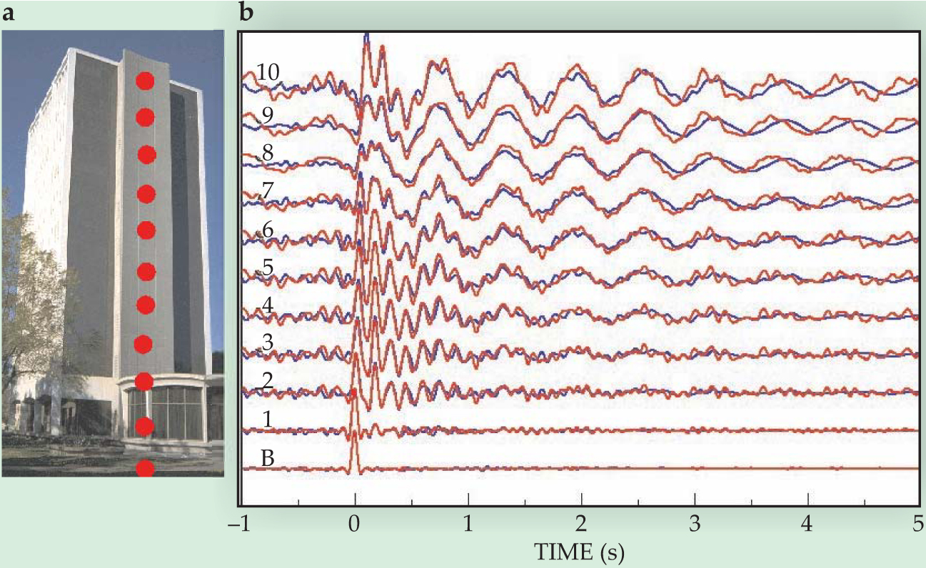 Figure 7. Monitoring building changes. (a) Accelerometers (indicated by red circles) in the Millikan Library at Caltech recorded the motion on various floors during the 2002 Yorba Linda earthquake. (b) The waveforms from two independent recordings, after deconvolution with the bottom floor’s motion. (The numbers indicate the building floor.) The waveforms represent each floor’s response to an incident impulse at the bottom floor.