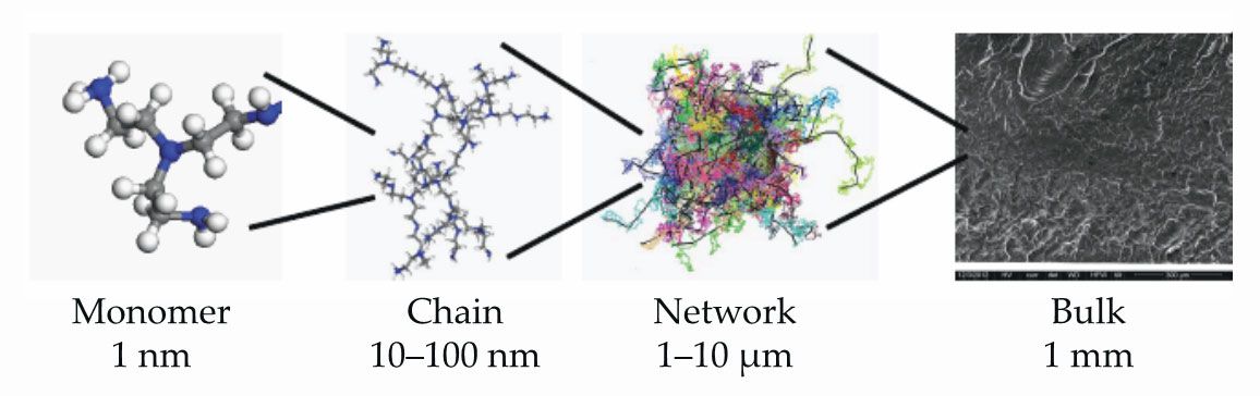 Figure. Polymeric materials exhibit different structures on a wide range of length scales. If a material is deformed, the structures relax on disparate characteristic time scales, from tens of picoseconds for monomers to hours or even years for bulk materials. Models of multiscale materials aim to describe bulk properties by capturing structural dynamics across length and time scales. (Adapted from Y. Li et al., Polymers5, 751, 2013, doi:10.3390/polym5020751.)