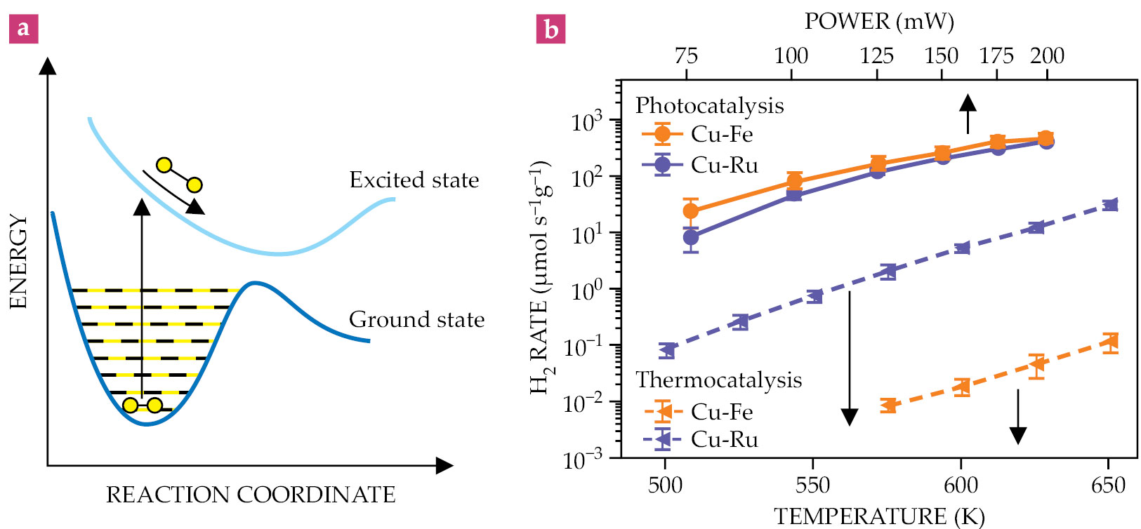 Plasmon catalysis. (a) A molecular adsorbate on a catalyst initially sits at the equilibrium position on a ground-state potential-energy surface and requires a certain activation energy to dissociate. Photoexcitation of the catalyst (a plasmonic particle) deposits energy into the adsorbate and elevates it to an excited state, where it can react. (Adapted from ref.