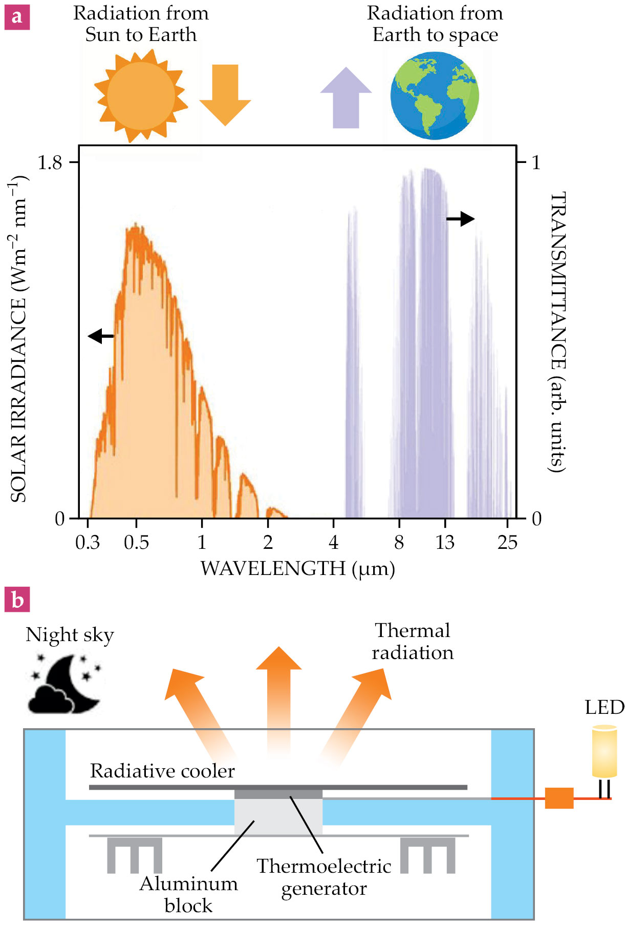 Nanophotonic systems can control optical absorption and thermal emissivity for various applications. (a) At left, the spectral energy intensity of solar radiation is plotted per unit area and per unit wavelength; at right, the thermal radiation from Earth is plotted. For photovoltaic applications, absorption should be maximized in the range of solar radiation. For radiative cooling, absorption should be minimized in the same range while simultaneously maximizing emissivity in the range of atmospheric transparency. (Adapted from ref.