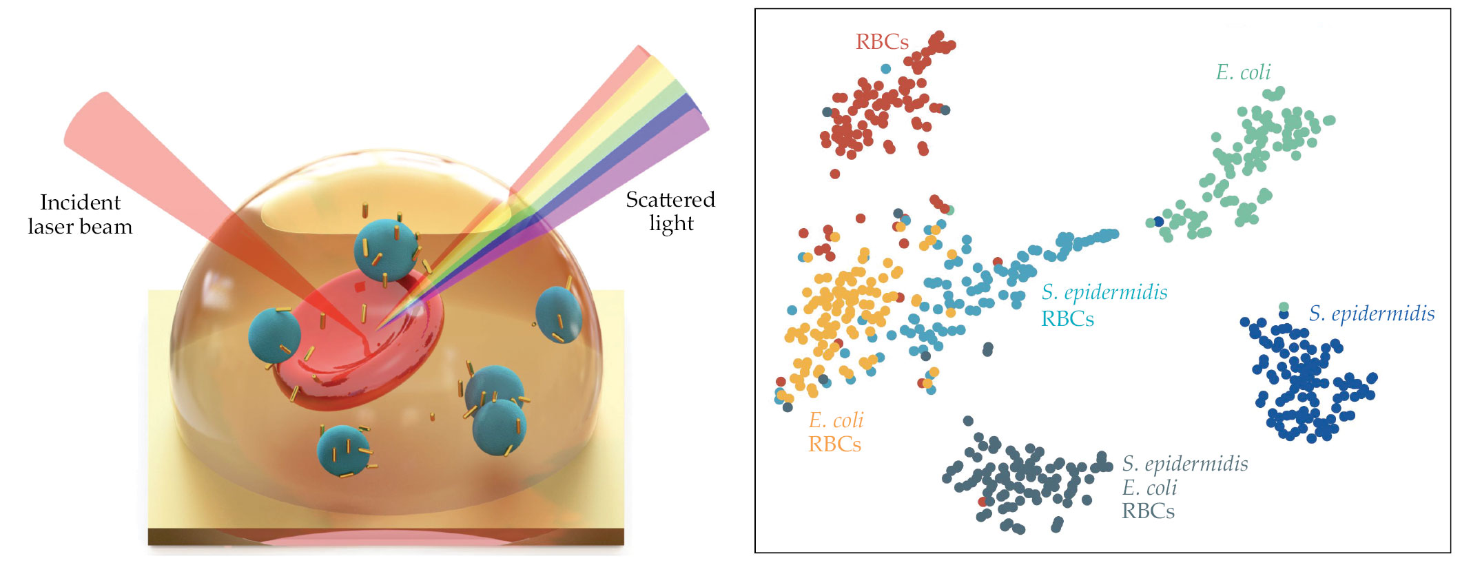 Nanophotonic sensors can monitor the environment in real time at high resolution. Surface-enhanced Raman scattering (SERS) can amplify weak vibrational signals to detect the presence of molecules. A schematic (left) illustrates the scattering of laser light into a liquid droplet composed of red blood cells (RBCs; red), bacteria (blue), and plasmonic nanorods (gold). Combined with machine learning, SERS can detect Escherichia coli, Staphylococcus epidermidis, and other pathogens (right, in a two-dimensional projection of the data) in complex liquid samples, such as blood and wastewater. (Adapted from ref.
