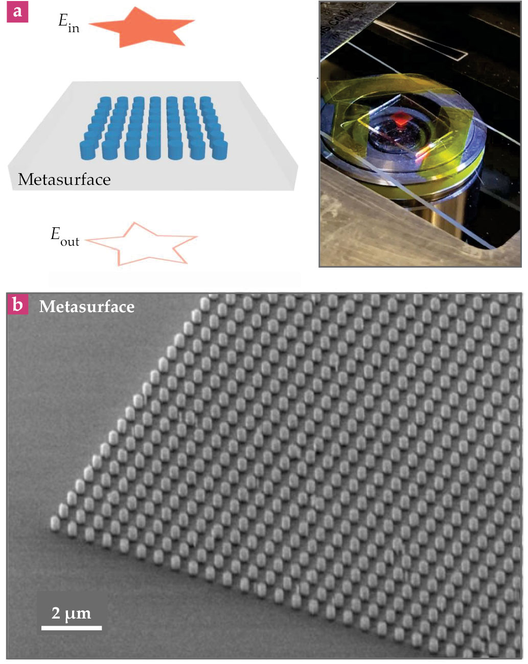 Metasurfaces can enable energy-efficient computing. (a) They are engineered to detect the edges in an image, a star in this case. By taking a second-order spatial derivative of an incident electric field Ein, the metasurface—an array of silicon nanorods, each one effectively a dipole antenna—generates an output image whose edges are enhanced, and the rest of the image is filtered out. The adjacent photograph shows a fabricated metasurface on a glass slide, atop a microscope objective. (b) This scanning electron micrograph shows the structure of the edge-detecting metasurface. (Adapted from ref.